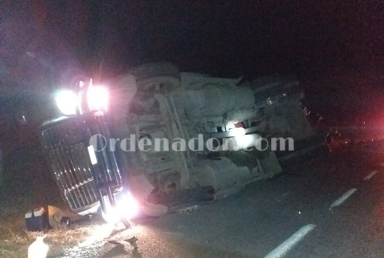 González, Tamps.- (29 Enero 2019)Un tráiler cargado con alambrón terminó por volcar la madrugada de este martes, luego de que el operador al perder la visibilidad bajó de la cinta de rodamiento desencadenando el percance vial, en el que resultó afortunadamente ileso.