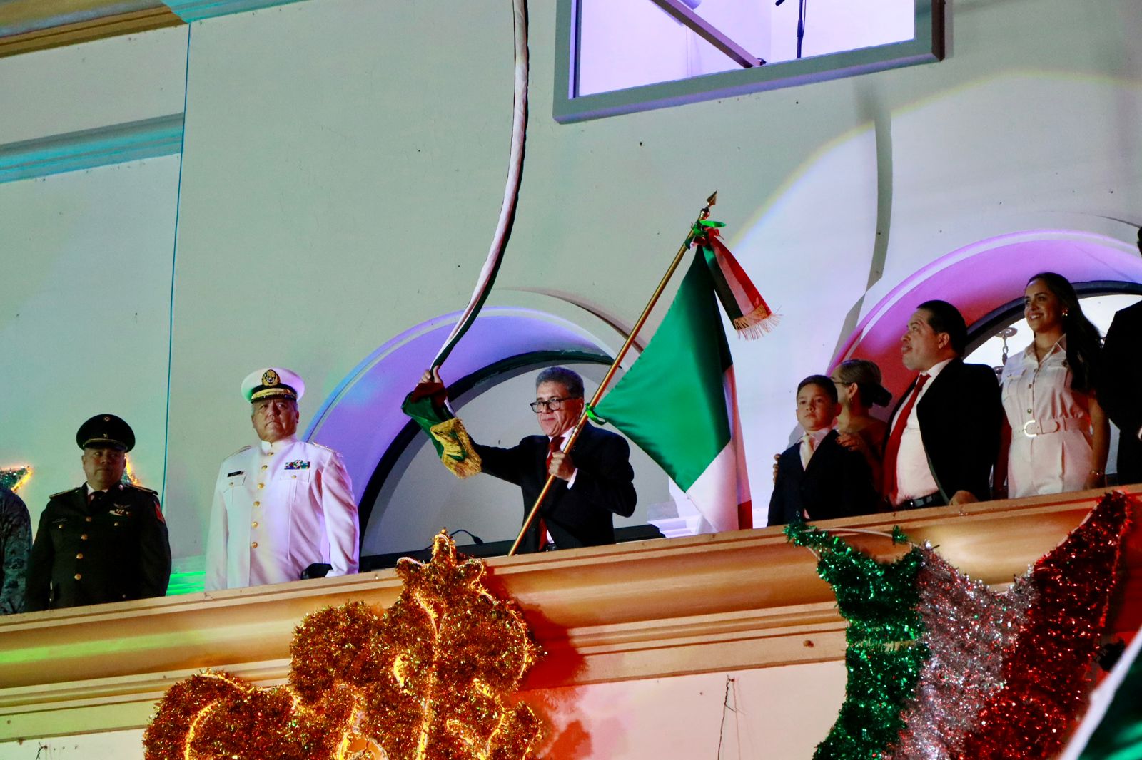 Más tarde, en la Presidencia Municipal, se realizó la ceremonia oficial del Grito de Independencia. En un acto solemne, el secretario del Ayuntamiento, José Francisco Pérez Ramírez, entregó la Bandera Nacional a la escolta del 15° Batallón de Infantería de la Secretaría de la Defensa Nacional, quienes a su vez la presentaron al presidente municipal.